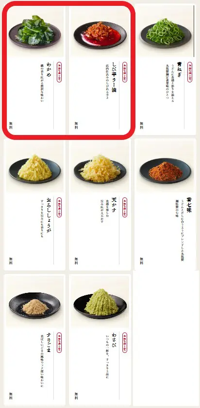 「わかめ」と「しび辛ラー油」の追加により、丸亀製麺の無料トッピング・薬味は以下の8種となりました。