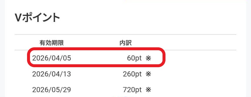 この200ptは元々2026/04/05期限のポイントで、上記で「Vポイント➡PayPayポイント」に交換したものをそっくりそのまま再交換したものですが、「PayPay➡Vポイント」に交換したことで、有効期限が交換日より1年後の「利用先限定ポイント」になりました。