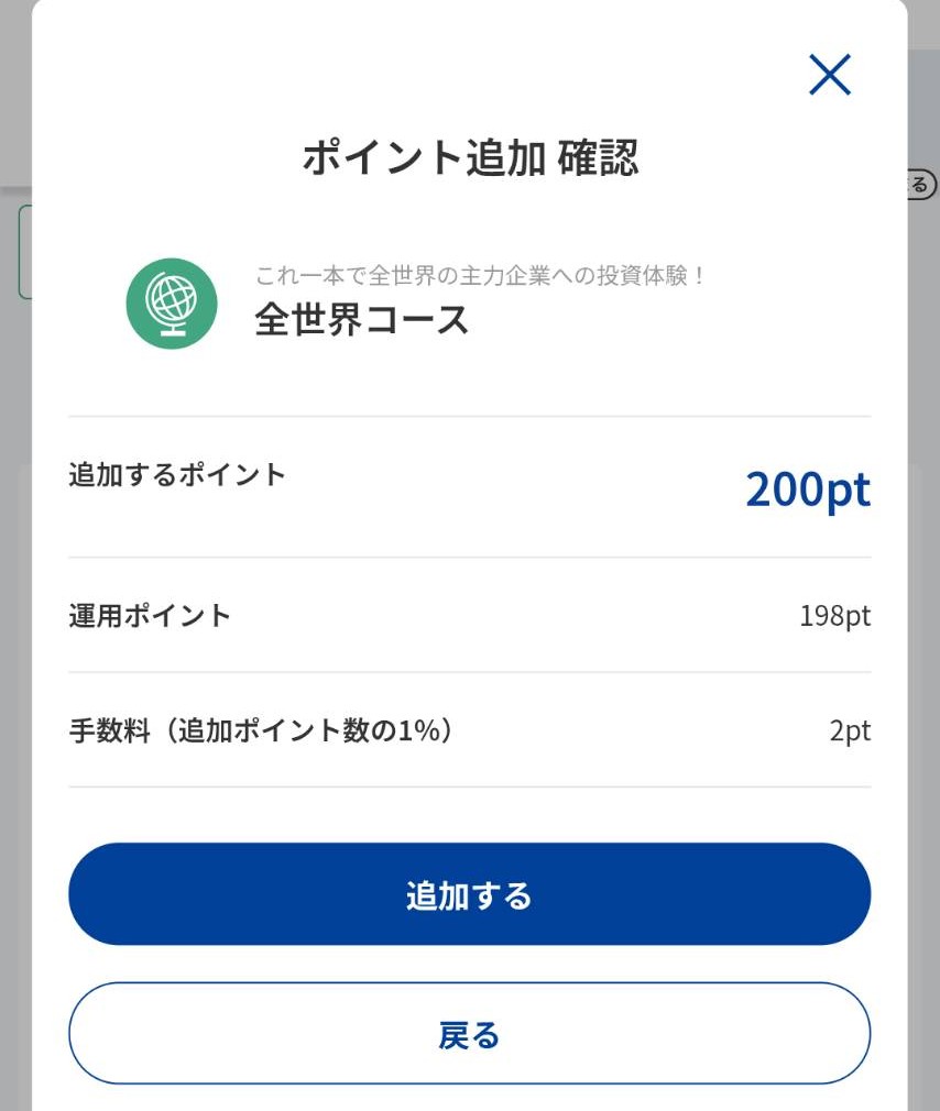 この時「自動追加設定」だと手数料が無料ですが、今回は手動で「ポイントを追加」したため、1%が手数料となり、実際の運用ポイントは198ptになりました。