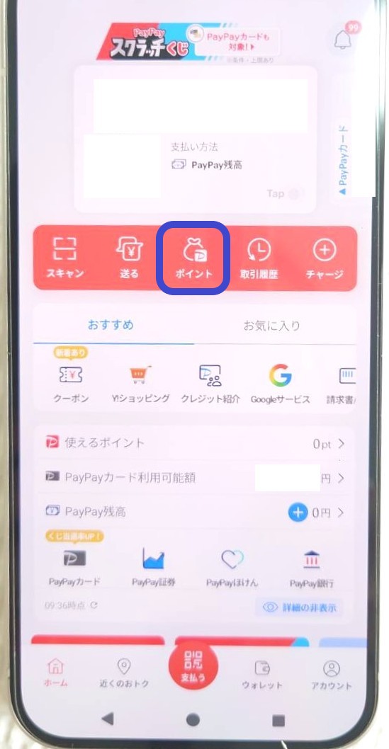 初めに、PayPayアプリトップから「ポイント」をタップします。