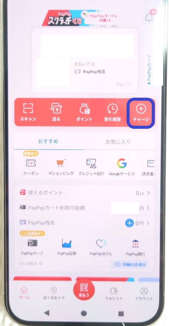 初めに、PayPayアプリの「チャージ」をタップし、