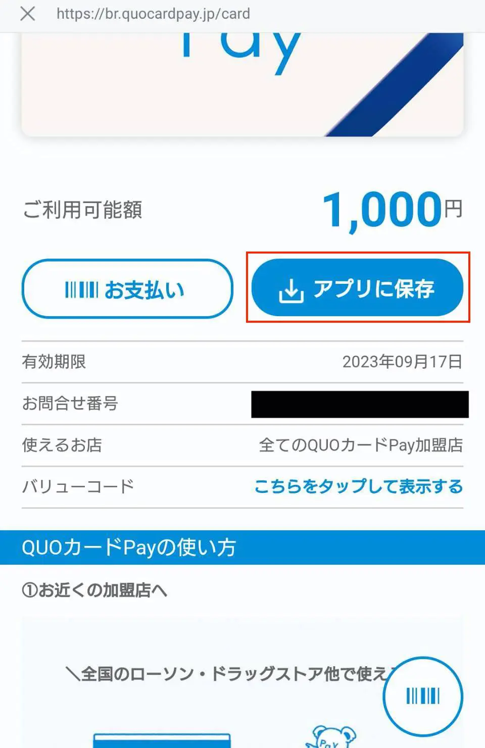 このバリューコードをクオカードペイアプリの「コード入力」の画面で入力することで、アプリに残高を保存することも可能です。