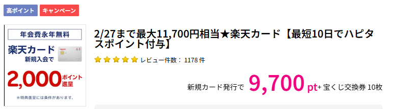 例えば本記事更新時点(2026年2月27日)では、ハピタスというポイントサイトを経由して楽天カードを作成すると、公式特典とは別に9,700円相当のポイントが獲得できます。