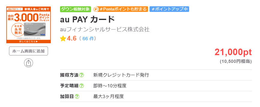 また2024年7月時点では、auPAYカードを持っていない人は、auPAYゴールドカードを新規作成すると、ポイントサイト(後述) & 新規入会・利用特典で、年会費を差し引いても20,000円相当が黒字になるので、まずは1年使ってみてから判断しても良さそうです。
