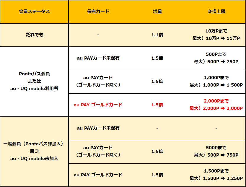 2024年6月以前は「前月のauPAYマーケットでの買い物額(1,000円以上)」が増量や交換上限を決める大事なポイントでしたが、現在はPontaパス会員であることに加え、auPAYカード もしくは au PAY ゴールドカードの保有が交換上限を最大にする決め手となります。