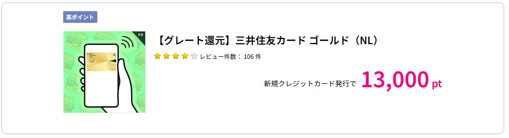 三井住友カードゴールドNLもハピタスで公式特典の最大23,600円相当とは別に13,000円相当のポイント、合計で最大36,600円相当が獲得できます。