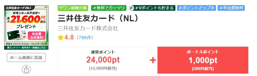 ノーマルカードの三井住友カードNLはちょびリッチで、公式特典の最大21,600円相当とは別に、12,500円相当のポイント、合計で最大34,100円相当が獲得できます。