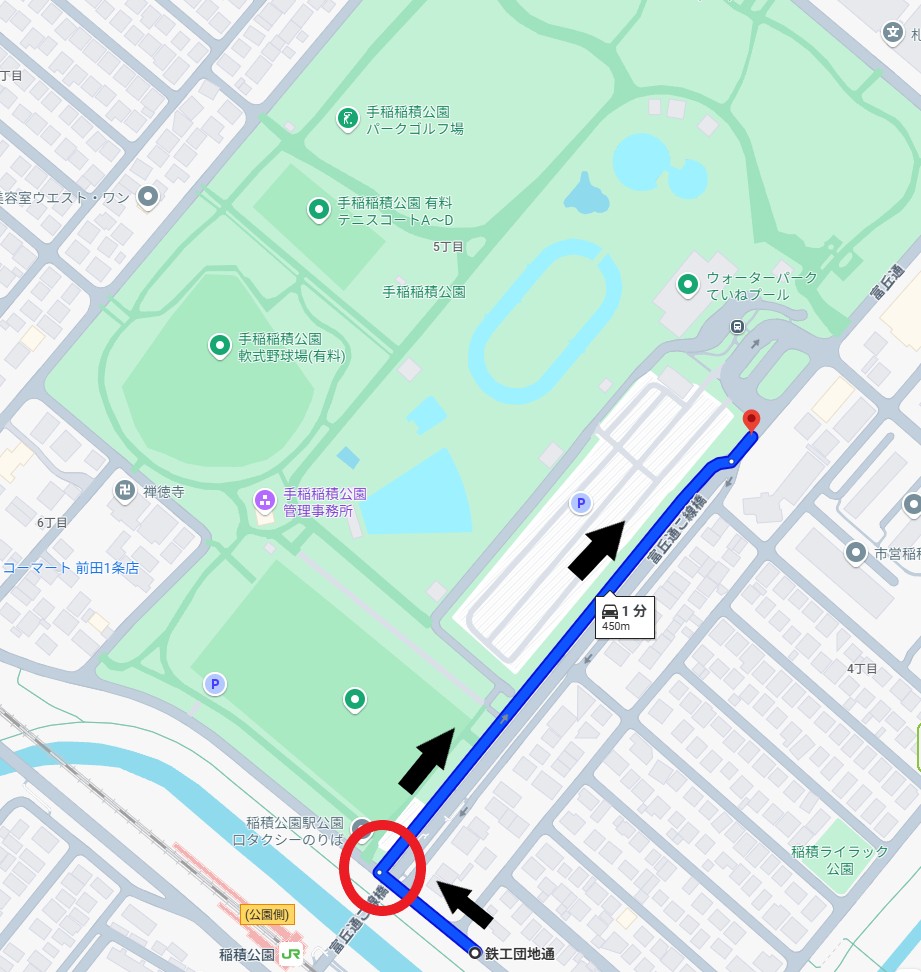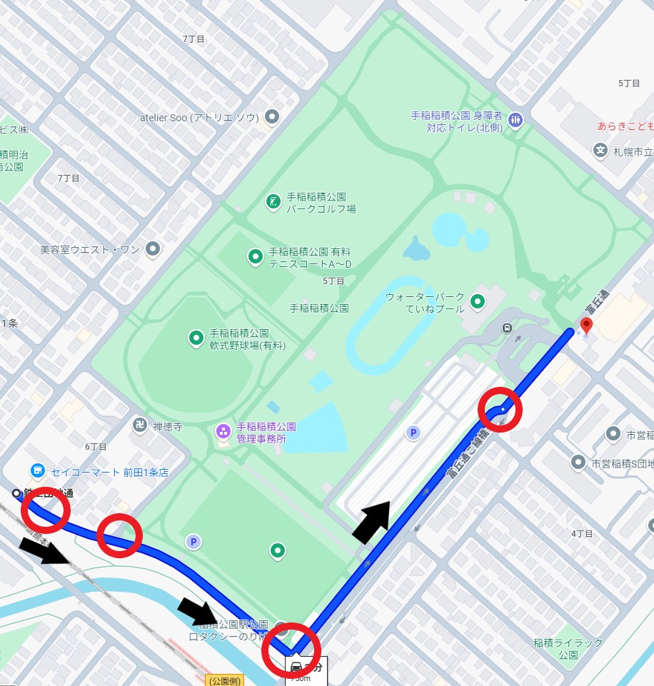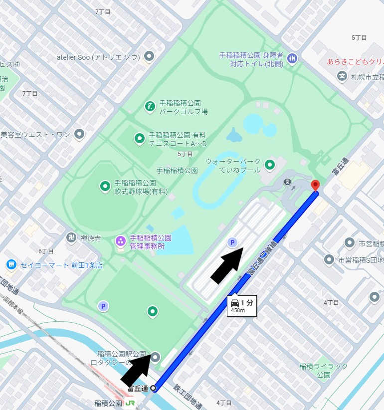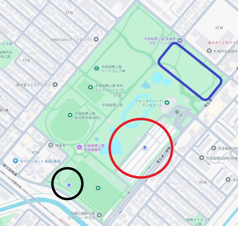 Google Mapで見ると、駐車場は大きく3つありますが、黒丸は「手稲稲積公園」利用者の駐車場のため、プール利用者は停めてはいけません。赤丸は第一駐車場で、真っ先に埋まります。青枠は臨時駐車場で、私はココに止めました。