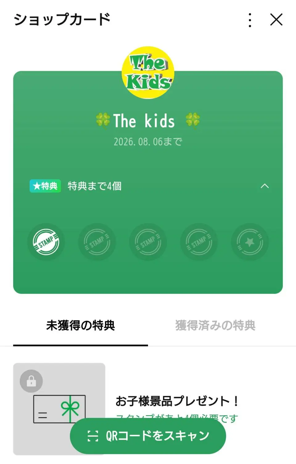 LINEのショップカードを5つ貯めると景品をもらえる特典があります(ショップカード取得より1年間有効)。