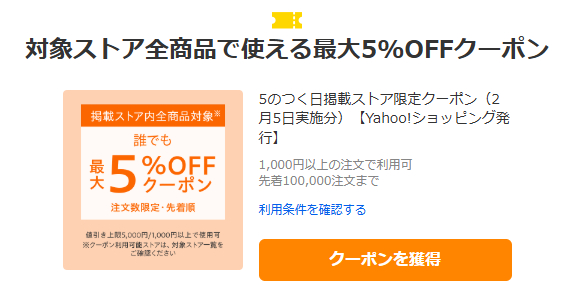 2つ目は掲載ストア限定の最大5,000円になる5%OFFクーポンです。