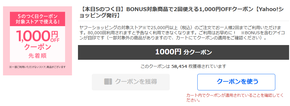 1つ目に配布の可能性があるのは1人2回使える、25,000円以上で1,000円OFFクーポンです。