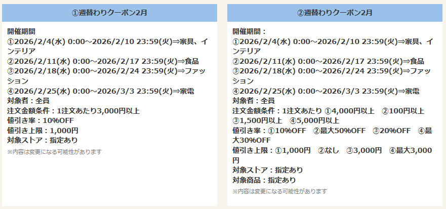 2026年2月の週替わりクーポン