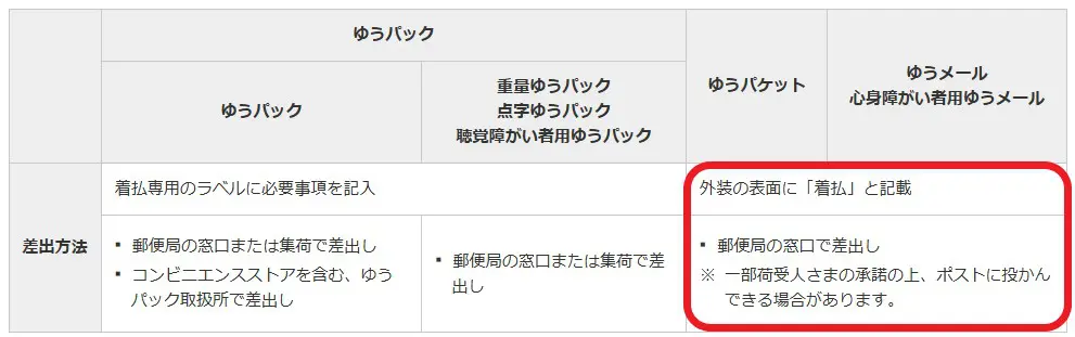 本来、ゆうパケット、ゆうメールはポスト投函が可能ですが、「着払い」時には基本的に窓口での差出となります。