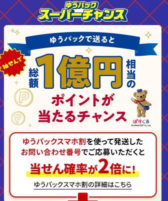ゆうパックを送って応募で、抽選で1,000ptまたは5,000ptが当たるキャンペーンなどです。