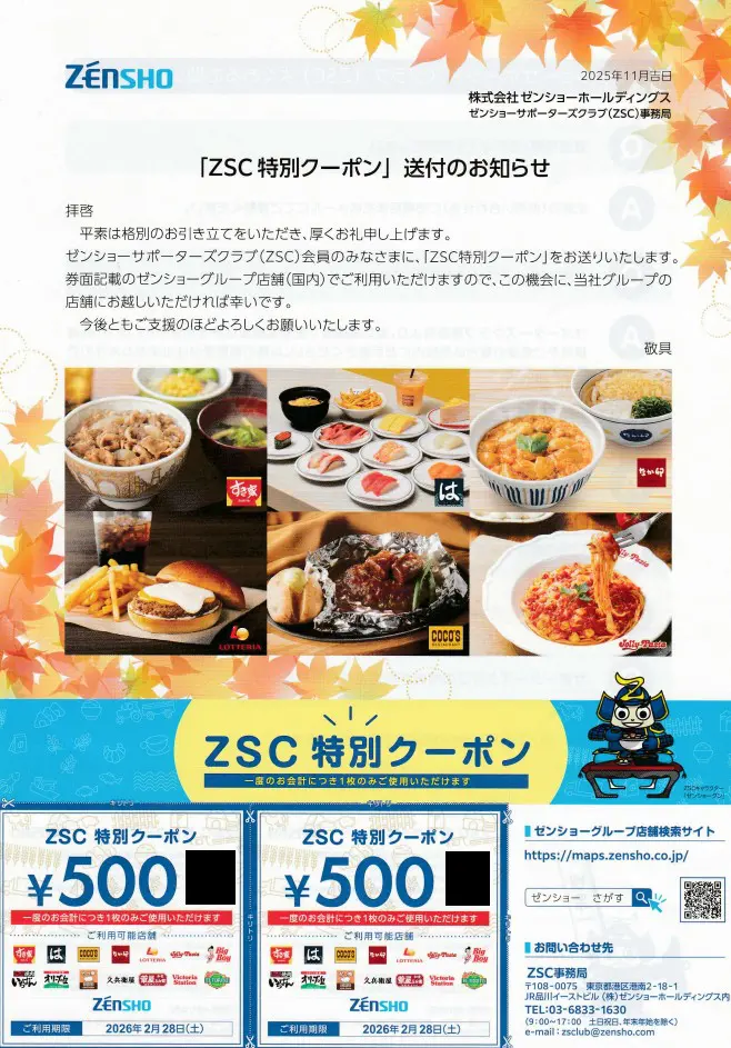 年に3回(3月、7月、11月)ZSC特別クーポンという名のクーポンが届きます。